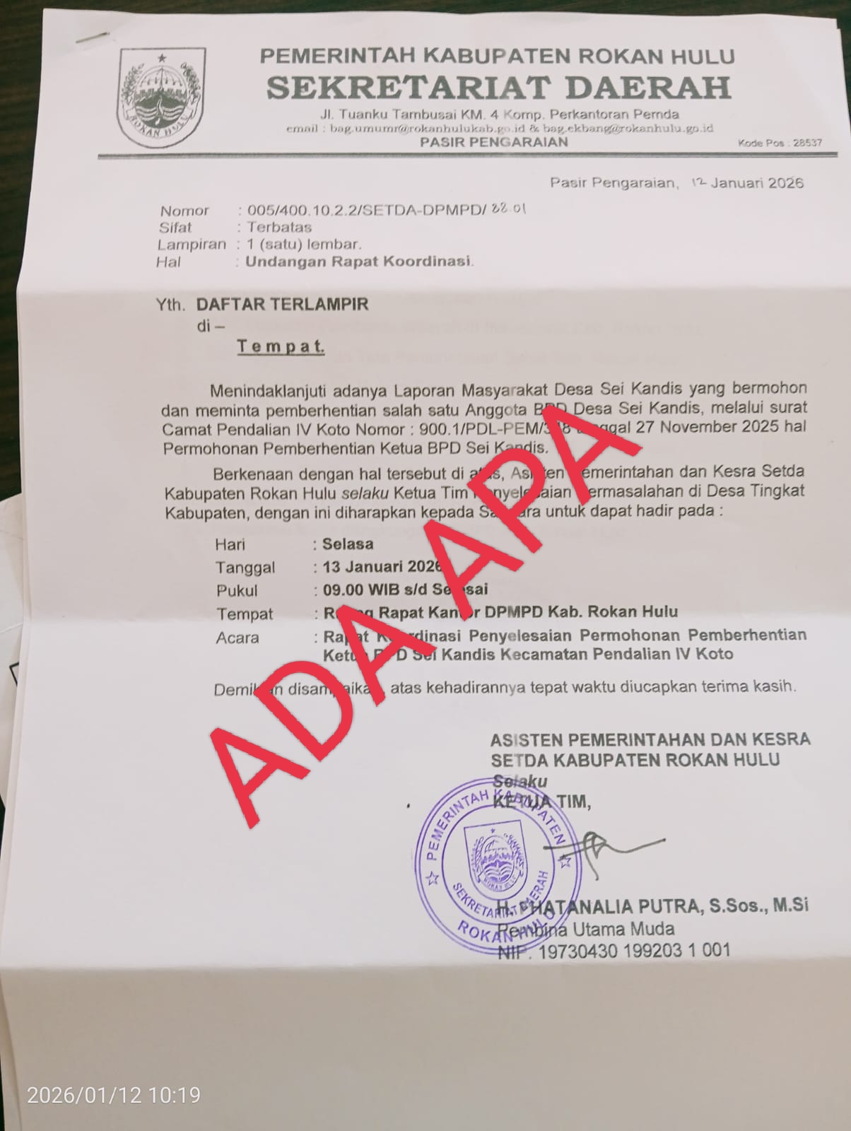 Berdasarkan surat resmi Camat Pendalian IV Koto Nomor 900.1/PDL-PEM/348 tertanggal 27 November 2025, sejumlah pihak yang mengatasnamakan “masyarakat” mengajukan permohonan pemberhentian Ketua BPD Sei Kandis. Lebih mengagetkan lagi, Pemerintah Kabupaten Rokan Hulu langsung memproses permintaan itu. Bahkan, rapat resmi telah dijadwalkan: