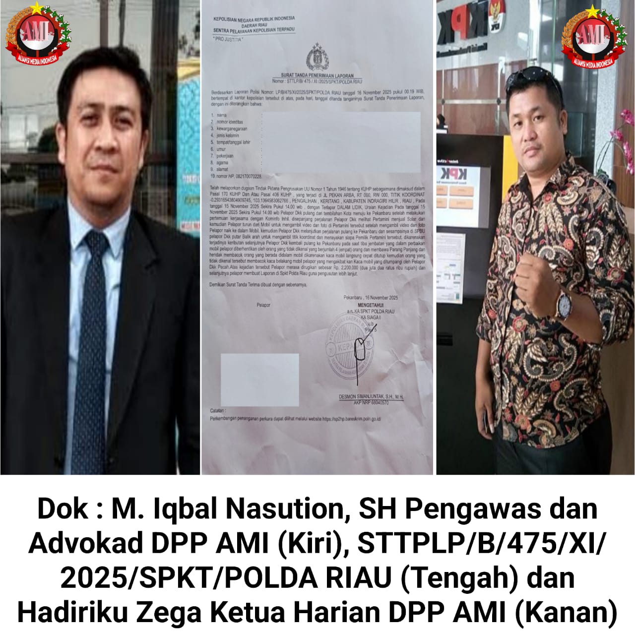 Pengawas DPP dan Pendiri AMI, M. Iqbal Nasution, SH dan Candra Sarlata, SH, dalam siaran persnya meminta pihak kepolisian memberikan atensi penuh terhadap laporan yang disampaikan para jurnalis AMI.