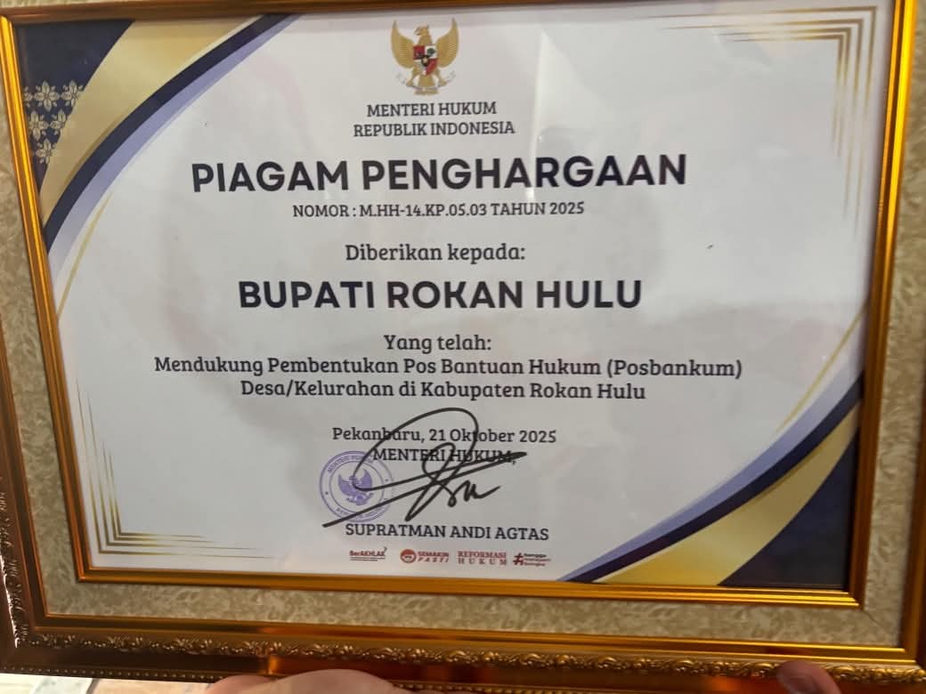 Bupati Rokan Hulu, Anton, ST, MM, menerima penghargaan dari Kementerian Hukum dan Hak Asasi Manusia Republik Indonesia (Kemenkumham RI) atas dukungannya dalam pembentukan Pos Bantuan Hukum (Posbakum) Desa/Kelurahan di wilayah Rokan Hulu.