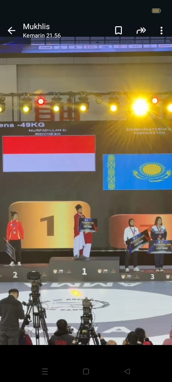 “Ini adalah prestasi membanggakan kembali yang ditorehkan atlet Indonesia di kancah internasional., Delvi Nurfadilah, atlet Mixed Martial Arts (MMA) asal Desa Mahato, Kecamatan Tambusai Utara, Kabupaten Rokan Hulu Provinsi Riau, sukses menorehkan sejarah dengan meraih Juara I sekaligus Medali Emas pada ajang 3rd AMMA Championship 2026 yang digelar di Luzhou, Cina, 7-11 Januari 2026, panggilan akrabnya Delvi yang turun di kelas 48 kilogram merupakan atlet binaan PB Persatuan Tarung Campuran Indonesia (Pertacami) dan dipercaya mewakili Indonesia pada kejuaraan Asian MMA (AMMA) tingkat Asia
