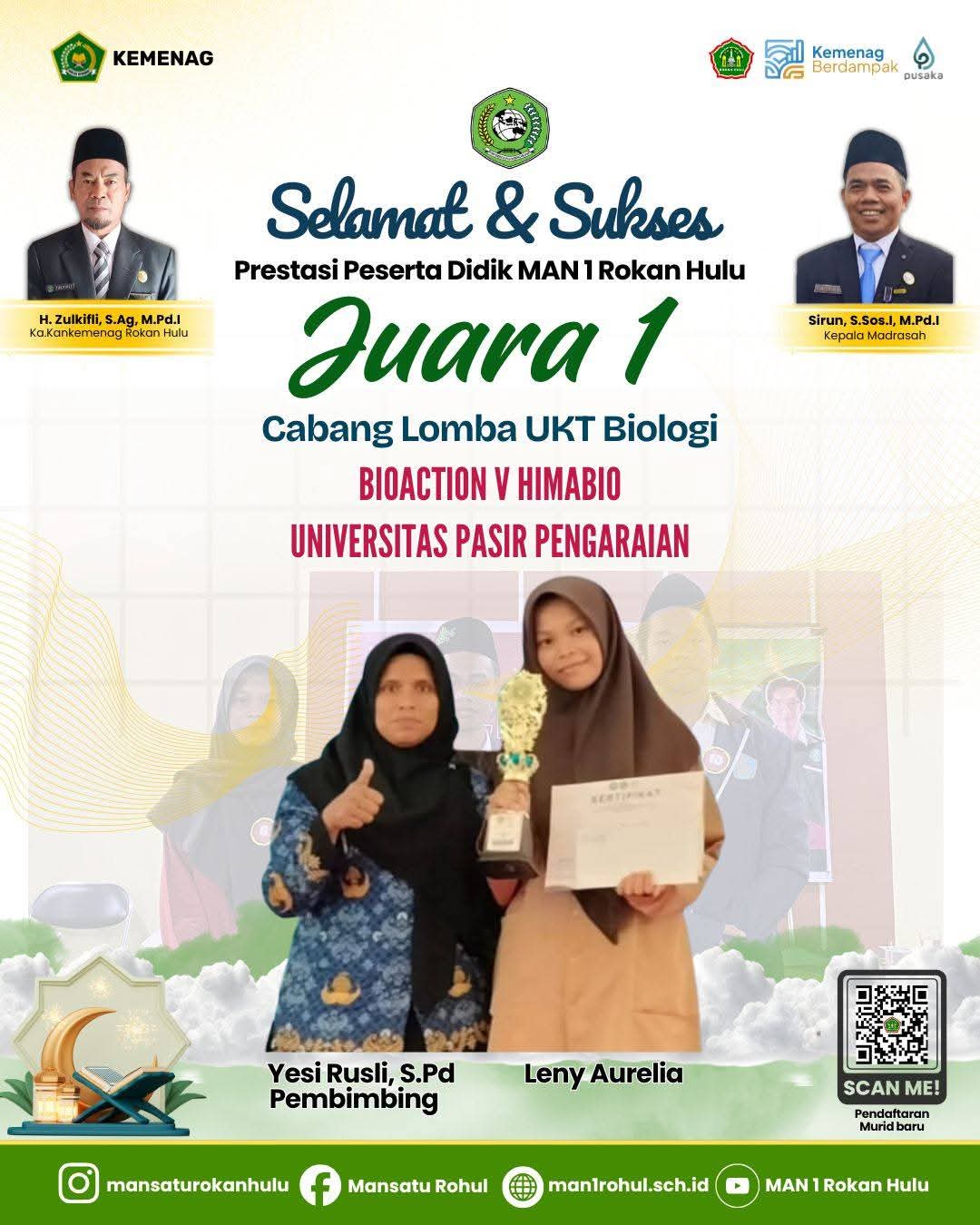 Leny Aurelia, siswi MAN 1 Rokan Hulu, meraih Juara 1 Uji Kompetensi Terpadu (UKT) Biologi di Universitas Pasir Pengaraian (UPP). Ia dibimbing oleh Ibu Yesi Rusli, S.Pd., dan menunjukkan performa luar biasa di setiap babak penilaian.